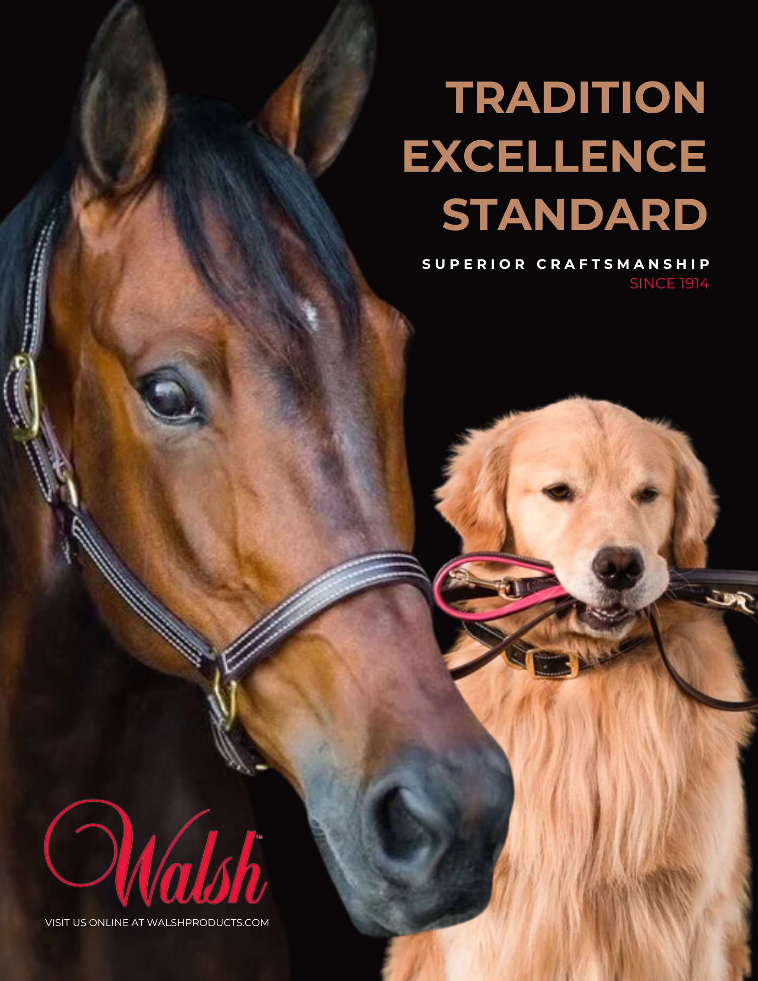 Walsh’s magazine advertisement showcased premium equine and canine products, emphasizing quality craftsmanship and trusted performance for animal care and training.